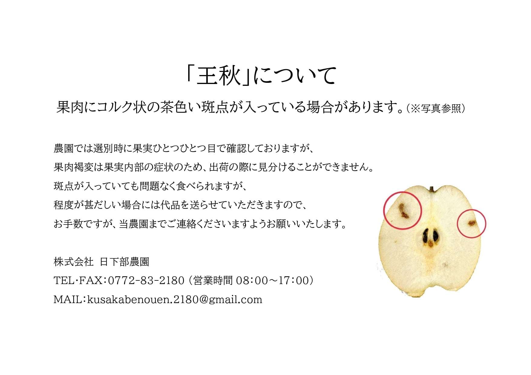 (*) 実の中に茶褐色の斑点が見られる場合がありますが、害はありません。気になる方は取り除いてお召し上がりください。